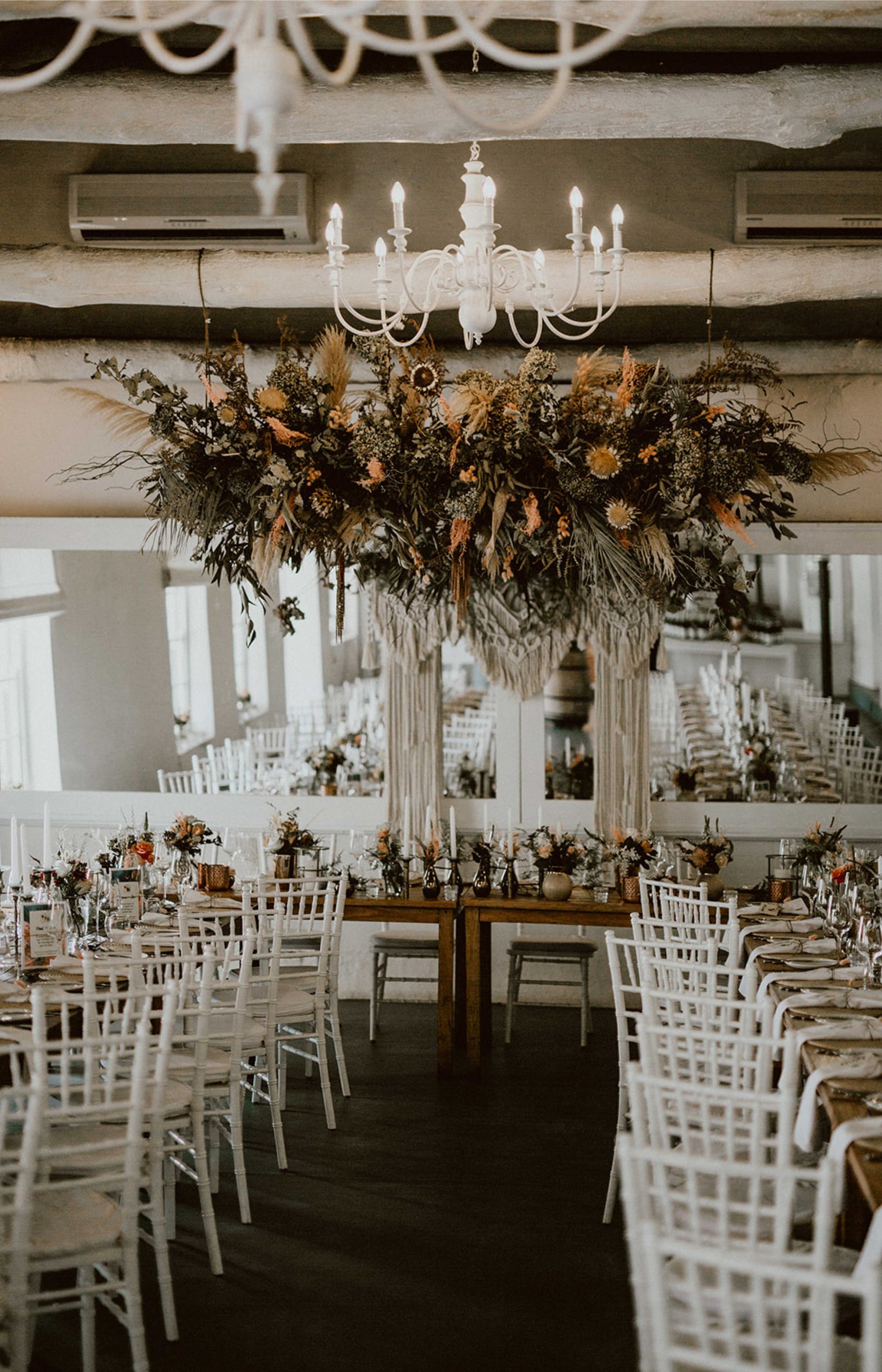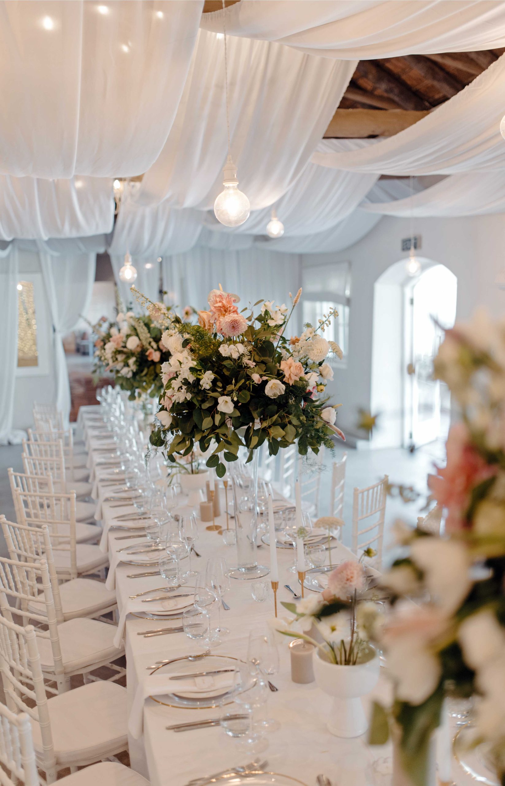 -All furniture required for ceremony and reception, including Wimbledon chairs, a white arch, white Tiffany chairs for the reception and 8-seater wooden tables.